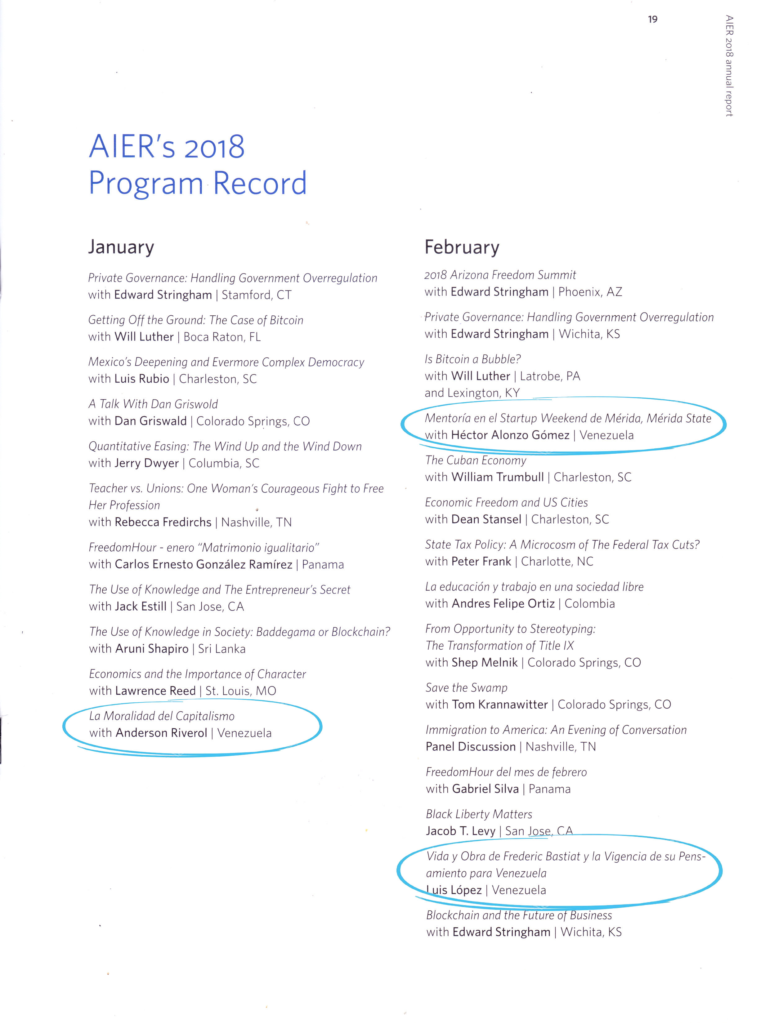 El trabajo del capítulo Venezuela de la Sociedad Bastiat es ampliamente reconocido en el Reporte Anual 2018 del American Institute for Economic Research AIER; de los 198 eventos que hizo AIER por todo el mundo, 45 fueron realizadas por el equipo de Venezuela, lo cual representa un 22,73% del total de eventos.