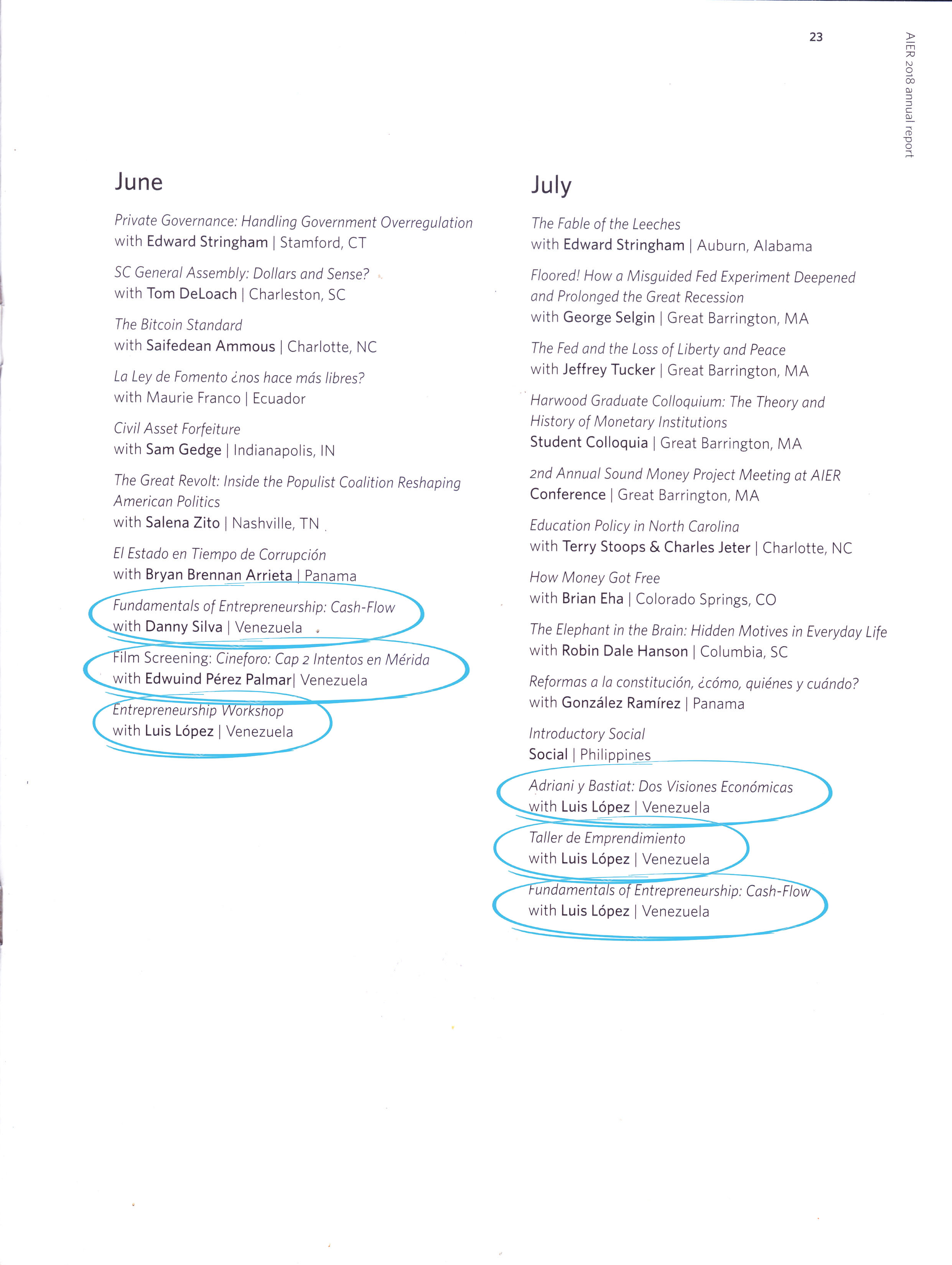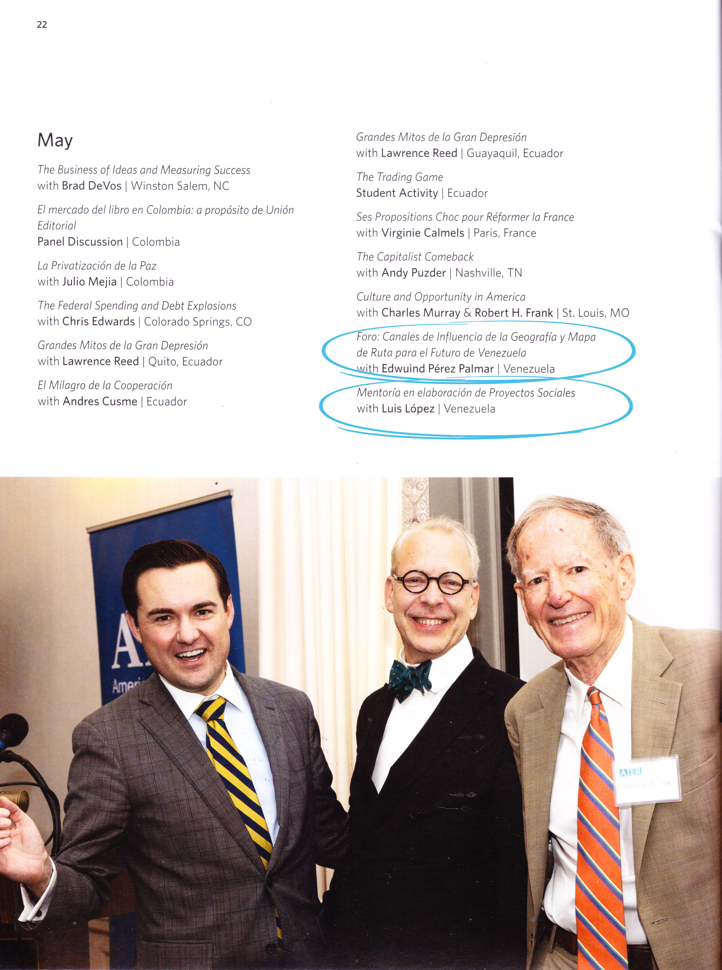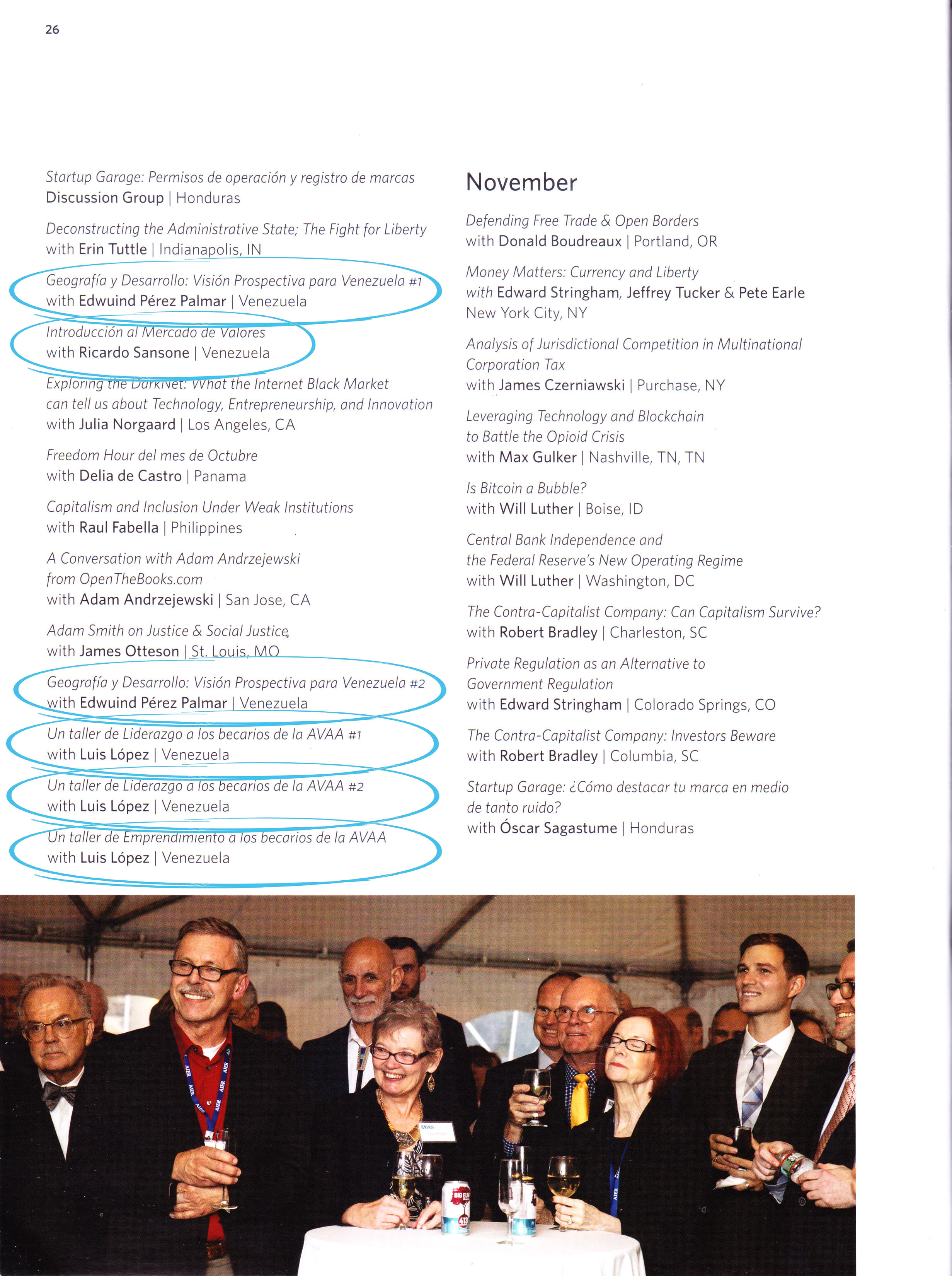 Tuvimos una temática muy variada en nuestros eventos, incluimos emprendimiento, liderazgo, economía, los fundamentos morales del capitalismo, críticas al socialismo, el mercado de valores, petróleo, así como la vida, obra y pensamiento de Frederic Bastiat y Alberto Adriani.