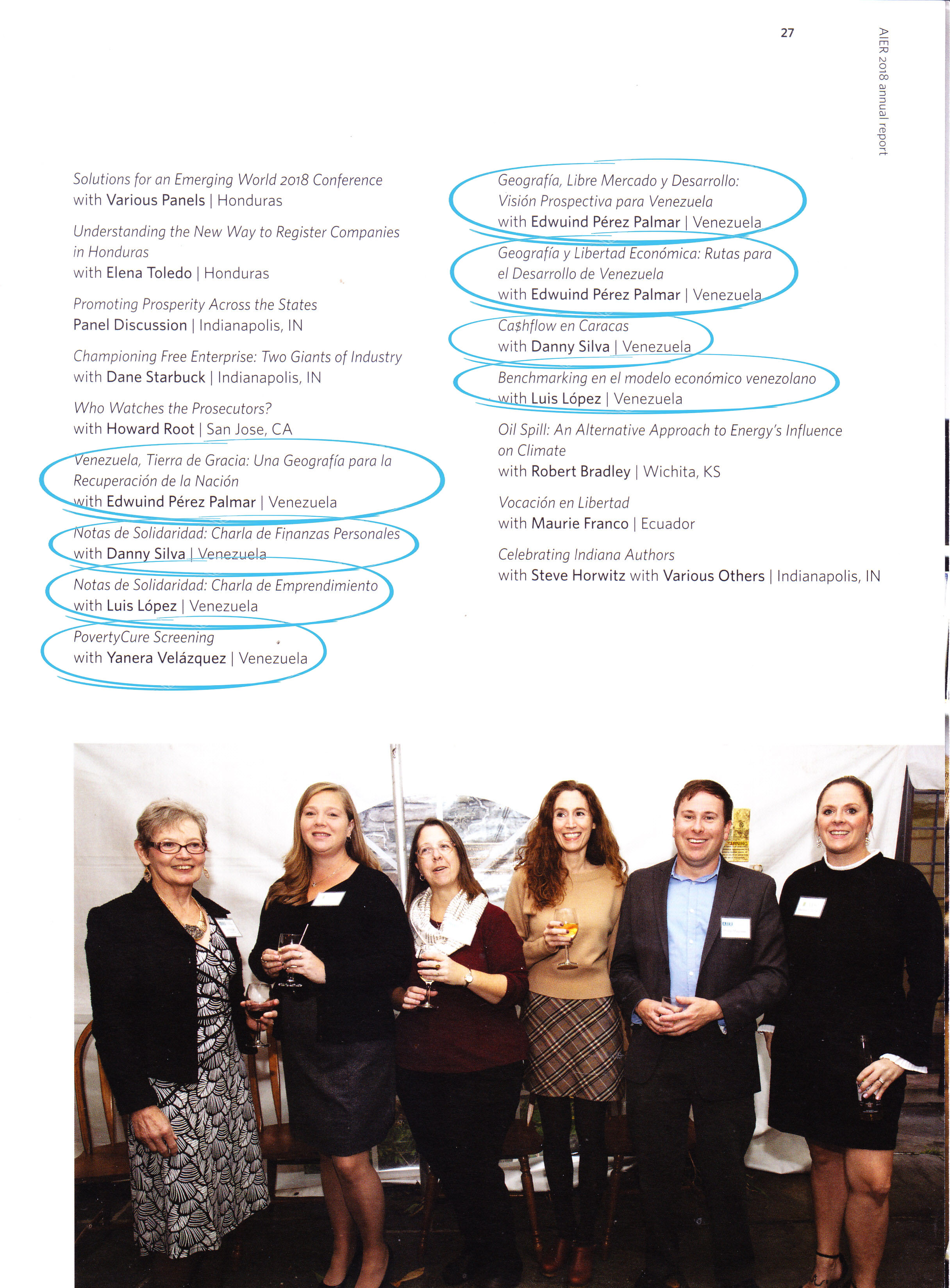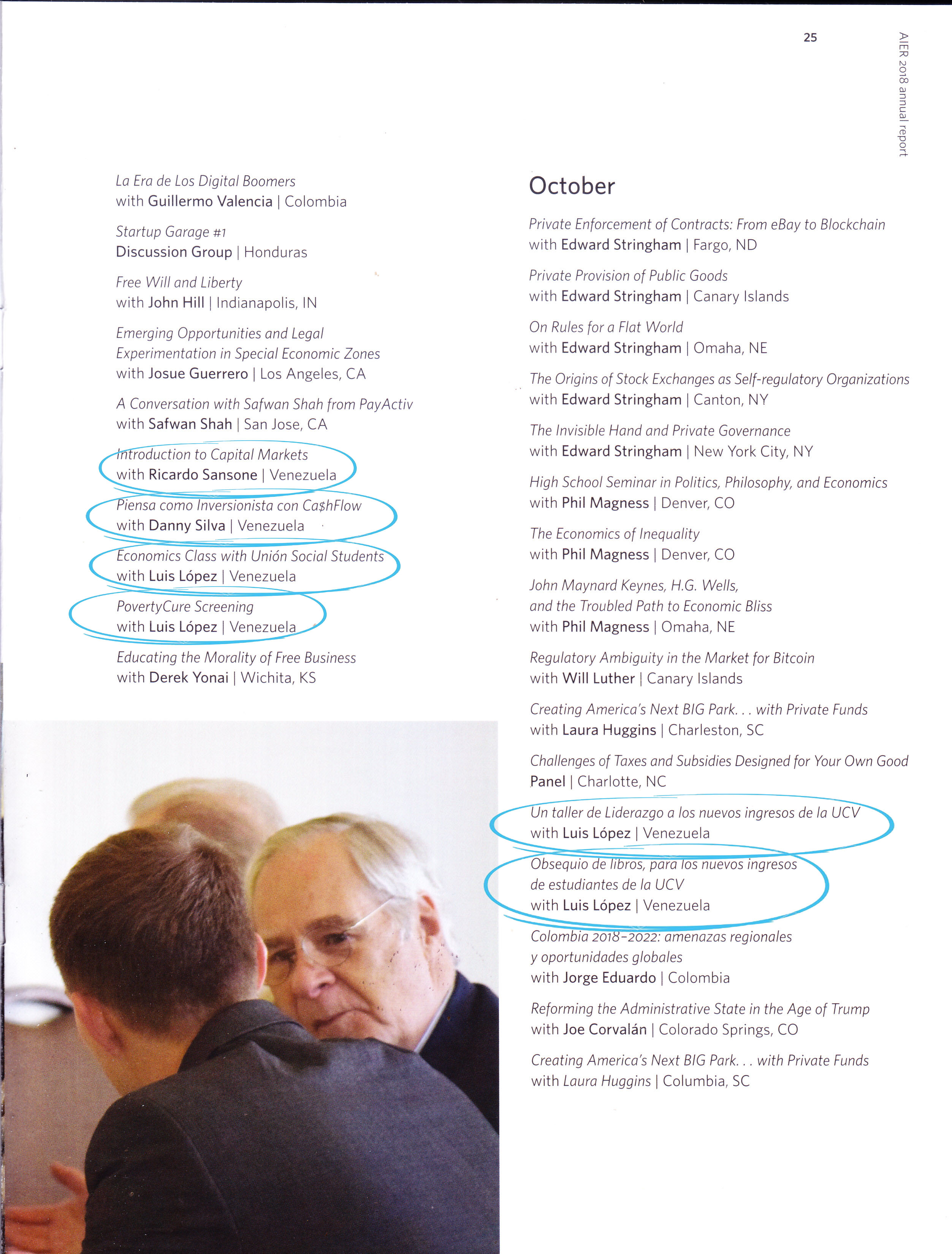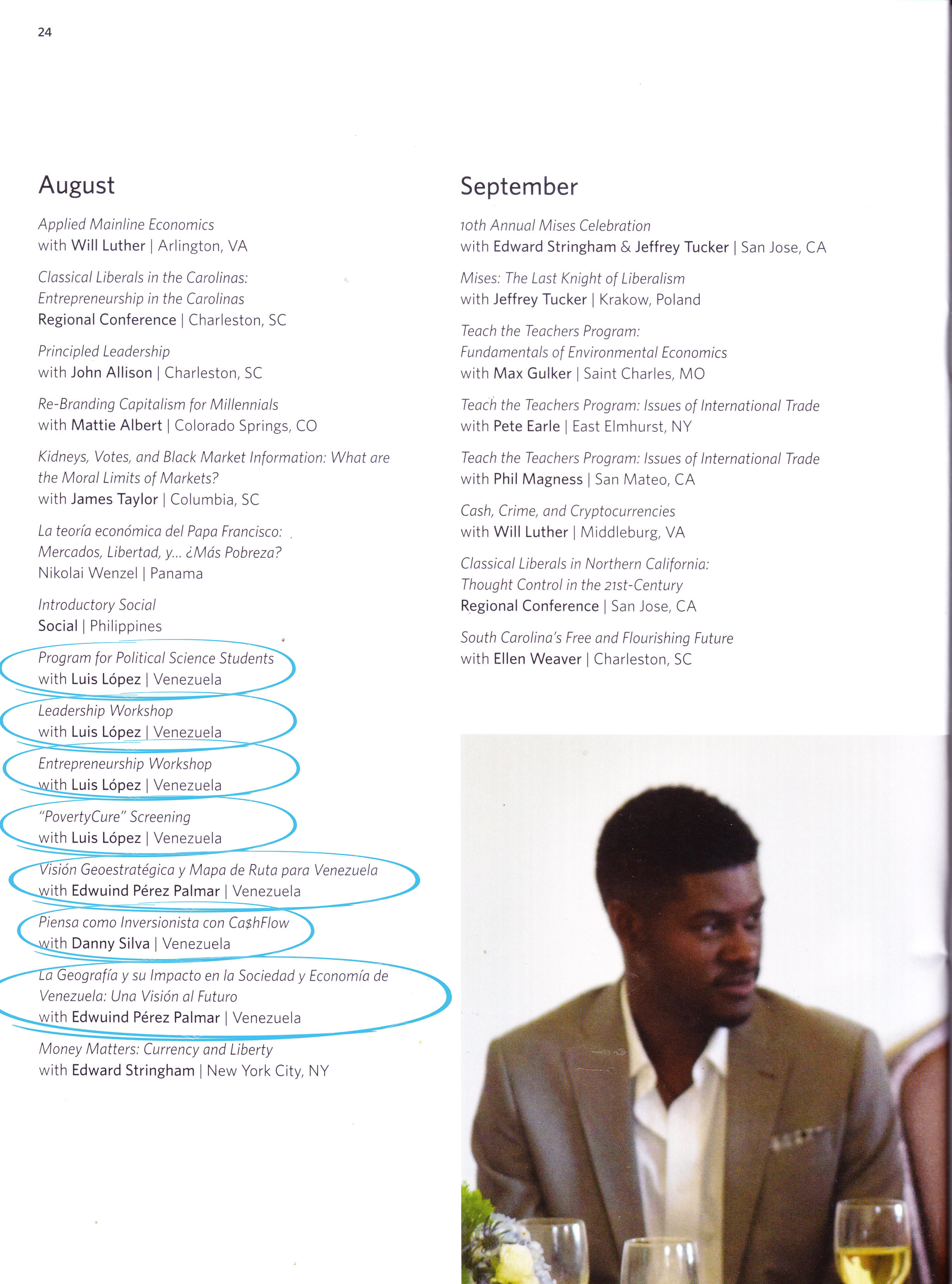Tuvimos una temática muy variada en nuestros eventos, incluimos emprendimiento, liderazgo, economía, los fundamentos morales del capitalismo, críticas al socialismo, el mercado de valores, petróleo, así como la vida, obra y pensamiento de Frederic Bastiat y Alberto Adriani.